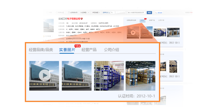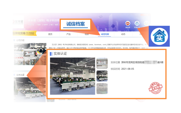 实体认证是冰球突破电子网付费会员的一项重要认证服务 ,在电子网IC搜索页、供应商搜索页、企业旺铺首页和诚信档案页等位置展示企业实体店铺的门头、办公环境、仓库等照片/视频等实体信息,增加被询盘的机会。
